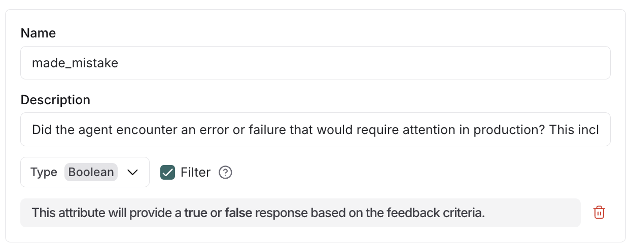 "filter_by": trueto any boolean attribute when creating a config for the Insights Agent - The LLM evaluates each trace against the attribute description during summarization